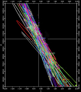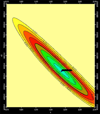 Dr Al-Chalabi has shown that the Vo, K parameters have a non-uniqueness if you accept a margin of error inherent in the measurements. This non-uniqueness leads to a solution trough where Vo,K combinations can tie the well equally well. Graph A is an output from Velit of one such solution trough for a Triassic layer in the UK's Southern Gas Basin. The Velit program has been used to provide a robust calculation of V0,K solution troughs for several wells.The overlap of the solution troughs suggests that the velocity behaviour should be explained by a variable Vo, while a constant K could tie all the wells with equal accuracy. |