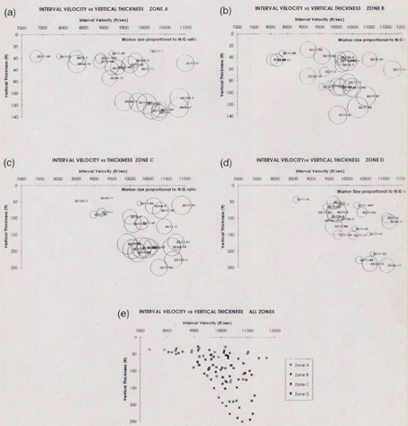 A study of 28 wells in a Tertiary reservoir. Here the aim was to see if there was a relationship with a layer's velocity and its thickness, for 4 seperate reservoir zones. A 3rd dimension is added to the graph by making the symbol proportional to the layer's N/G. While there is a general increase of Interval Velocity with thickness, (the deposition is thought to be channel controlled with the higher velocity sands concentrated in the channels) there is too much of a spread of values to provide an accurate depth conversion function. |